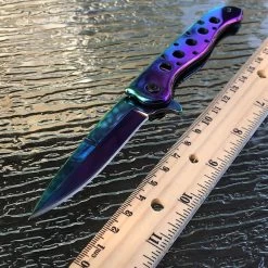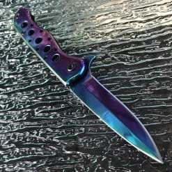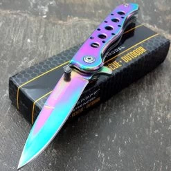 This 7.25″ Tac Force small rainbow pocket knife is a great collectors knife to have. Featuring a stainless steel blade and titanium rainbow handle with drilled hole design, this is a great knife to show off. This Tac Force tactical rainbow pocket knife comes with a belt clip.