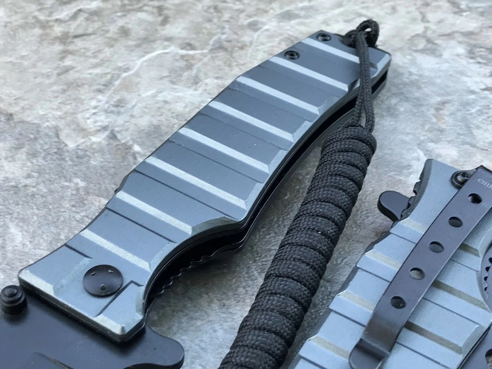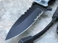 This military combat tactical silver spring assisted rescue pocket knife is a great knife to have. Featuring a sharp double edged partially serrated stainless steel blade and finger contoured silver handle, this knife feels great and gets the job done. This silver military pocket knife comes with a belt clip and lanyard.
