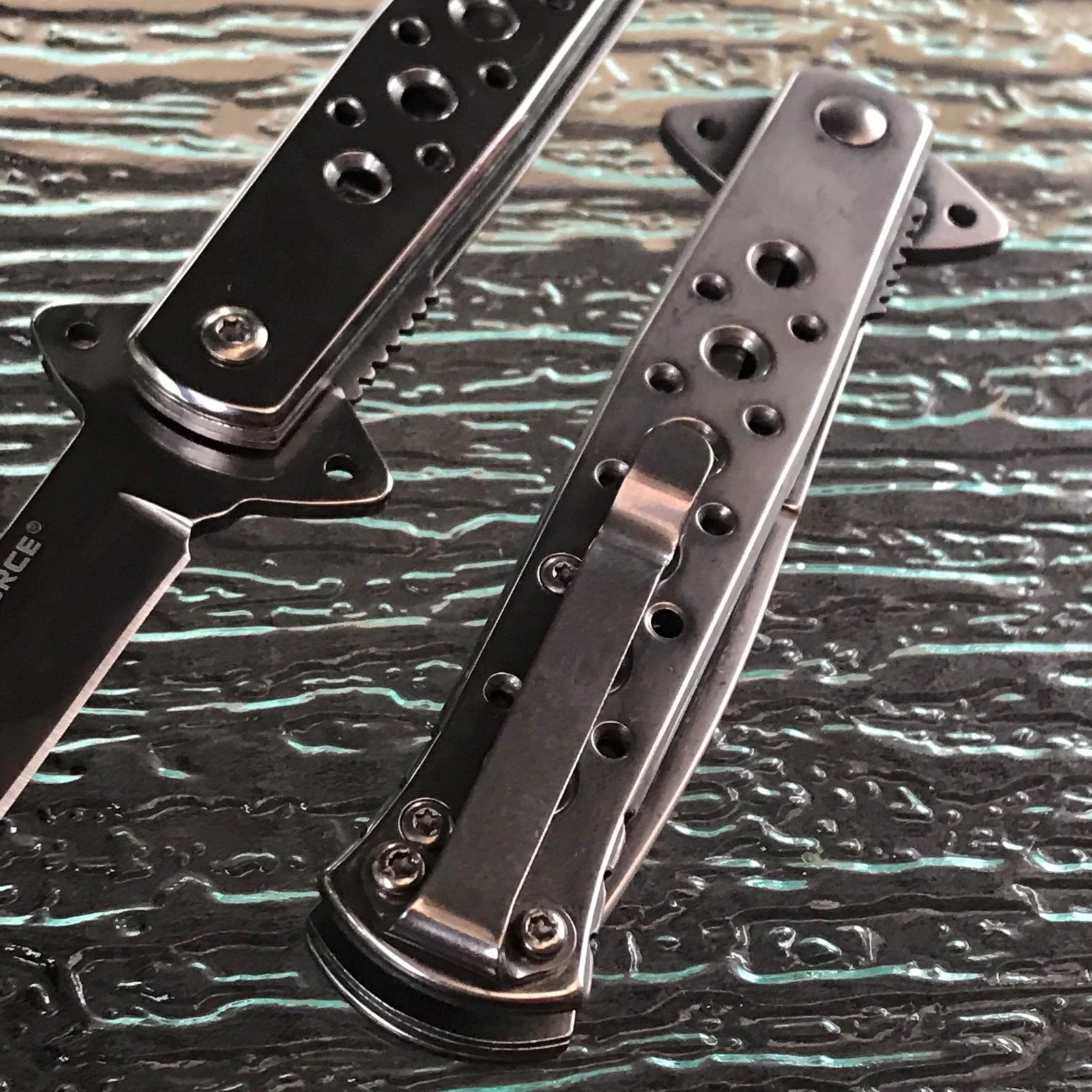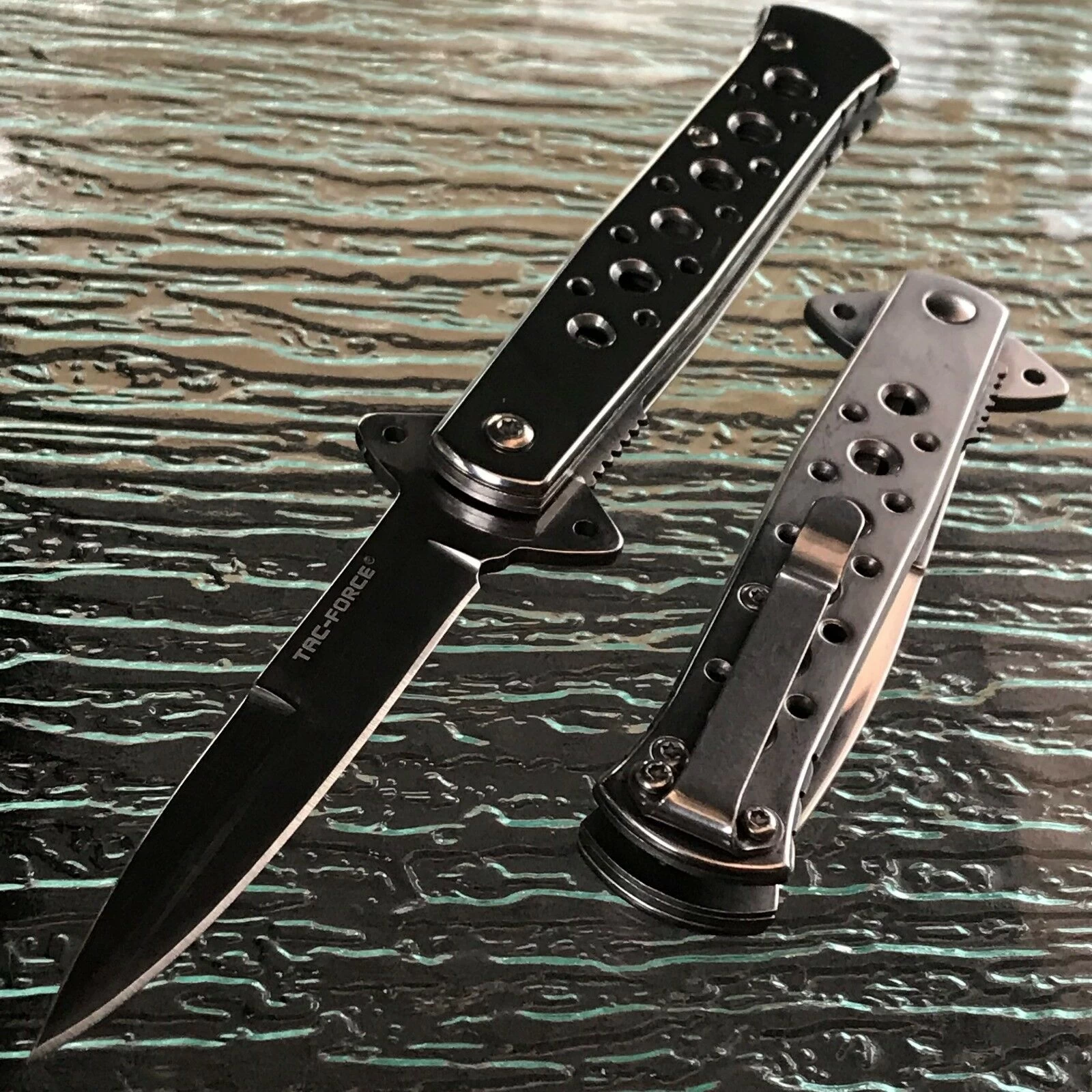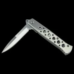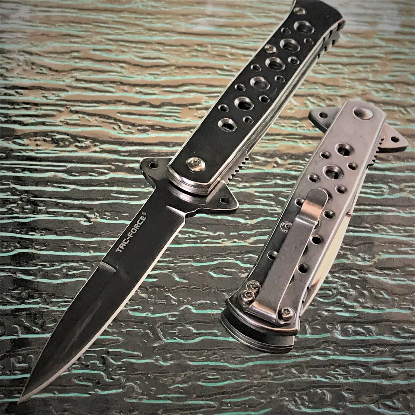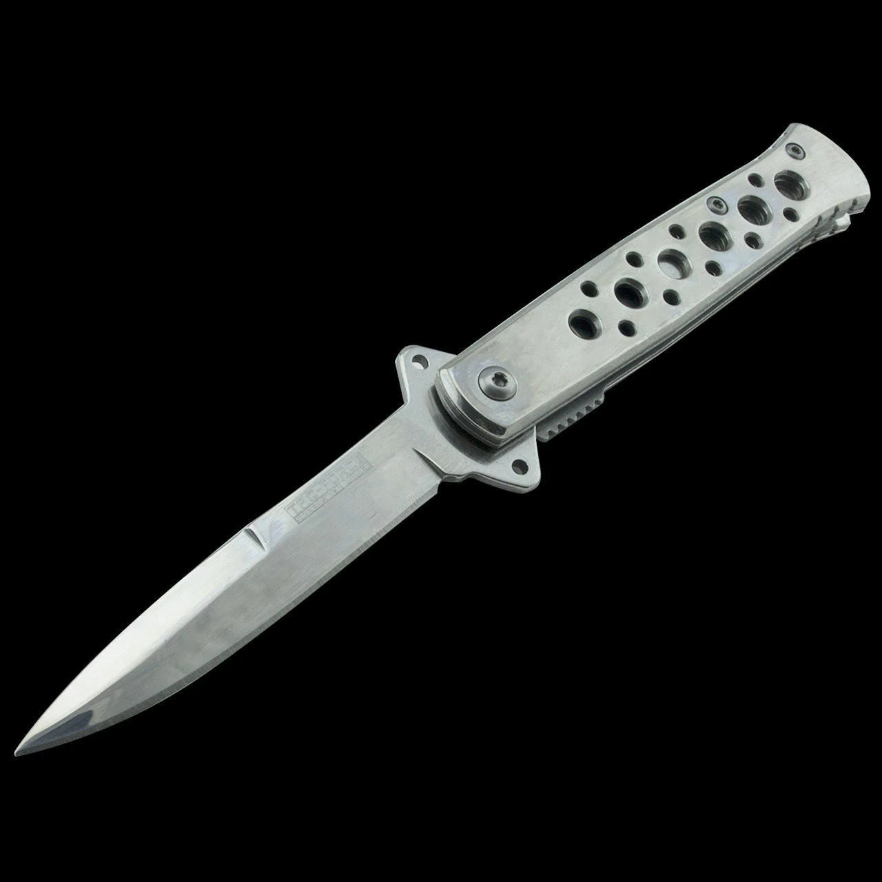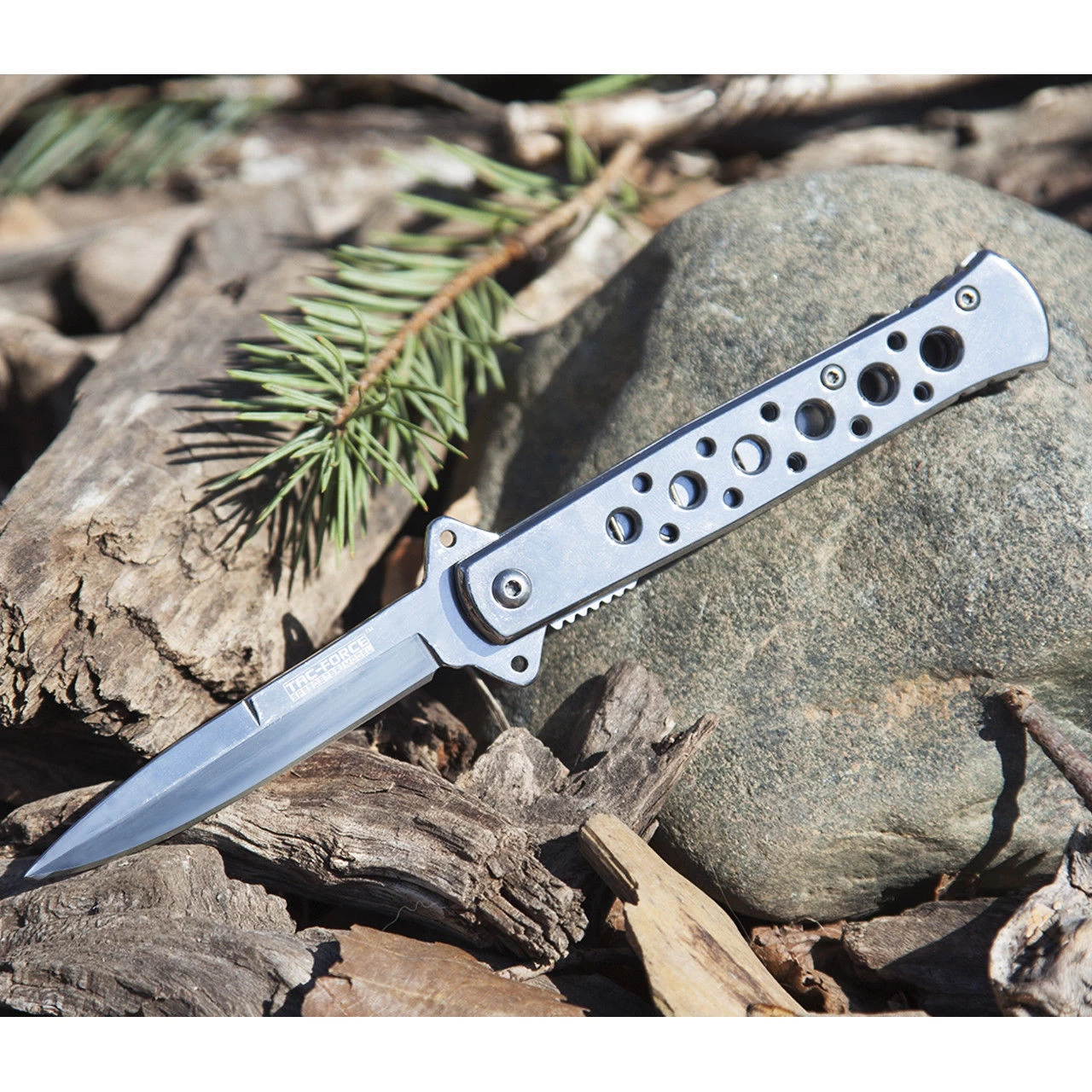 This 7″ Tac Force milano stiletto pocket knife is a great knife to carry. This safety pocket knife features a sharp stiletto style spear point blade and silver aluminum handle with drilled hole design, providing an excellent grip. This silver stiletto pocket knife comes with a belt clip for easy carry.