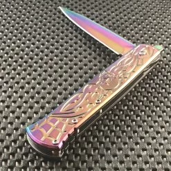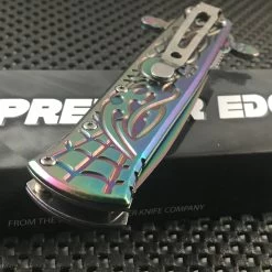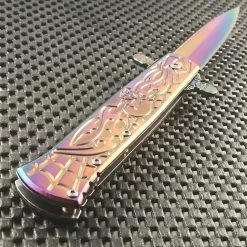 This 8.5″ Tac Force stiletto rainbow tactical knife is a great knife to have. This fantasy knife features a rainbow stiletto blade and a rainbow flames handle, making this knife great for any task and providing an excellent grip. This assisted opening tactical knife comes with a belt clip.Β
