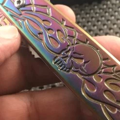 - Handle Finish:Β Rainbow Titanium Coated Handle – Flames Design