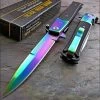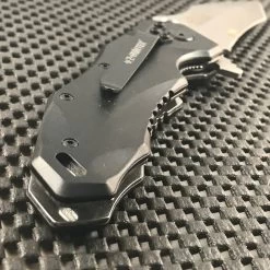 This 8.5″ Z-Hunter green blood splatter zombie skulls spring assisted pocket knife is a great fantasy knife to have. Featuring a tanto stainless steel blade and black aluminum handle with green blood splatter and skulls design, this fantasy skulls knife feels great. Comes with a belt clip.