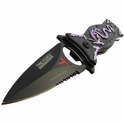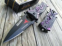 This 8″ Tac Force purple dragon knife is a great fantasy knife to have. This dragon pocket knife features a sharp stainless steel spear point blade and aluminum handle, making this knife perfect for piercing. This fantasy pocket knife’s handle is imprinted with a purple dragon design. Comes with a glass breaker.