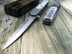 This 8″ Tac Force white pearl handle stiletto spring assisted tactical folding pocket knife is a great self defense knife to have. Featuring a spear point stainless steel silver blade and white simulated pearl handle, this pearl handle pocket knife looks great. This Tac Force milano knife comes with a belt clip.