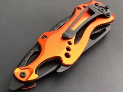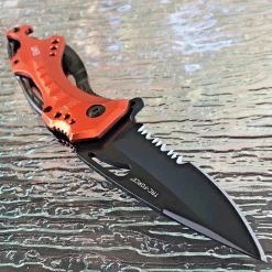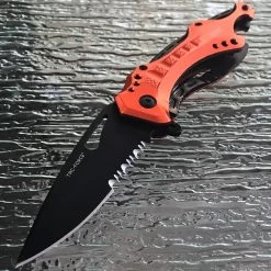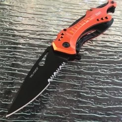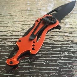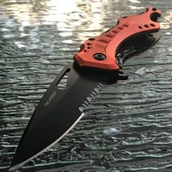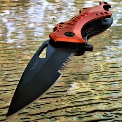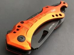 This 8″ Tac Force assisted open camping pocket knife makes is very functional. Featuring a very durable partially serrated stainless steel blade, this knife is great for making clean slices and cutting through strong materials. Comes with an orange metallic aluminum handle, a can opener, glass breaker, and belt clip.