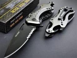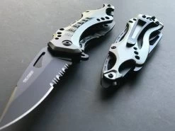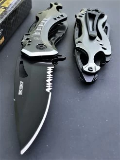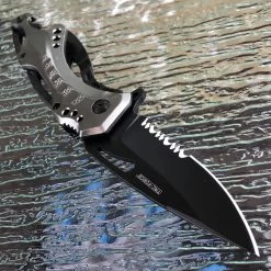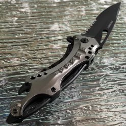 This 8″ Tac Force spring assisted tactical folding knife is the perfect tool to carry. Featuring a sharp half-serrated stainless steel blade, this knife will get any task done, from cutting tough materials to making accurate slices. The aluminum handle comes in a nice grey metallic finish and is equipped with a can opener and glass breaker at the end. Comes with a belt clip for easy carry.