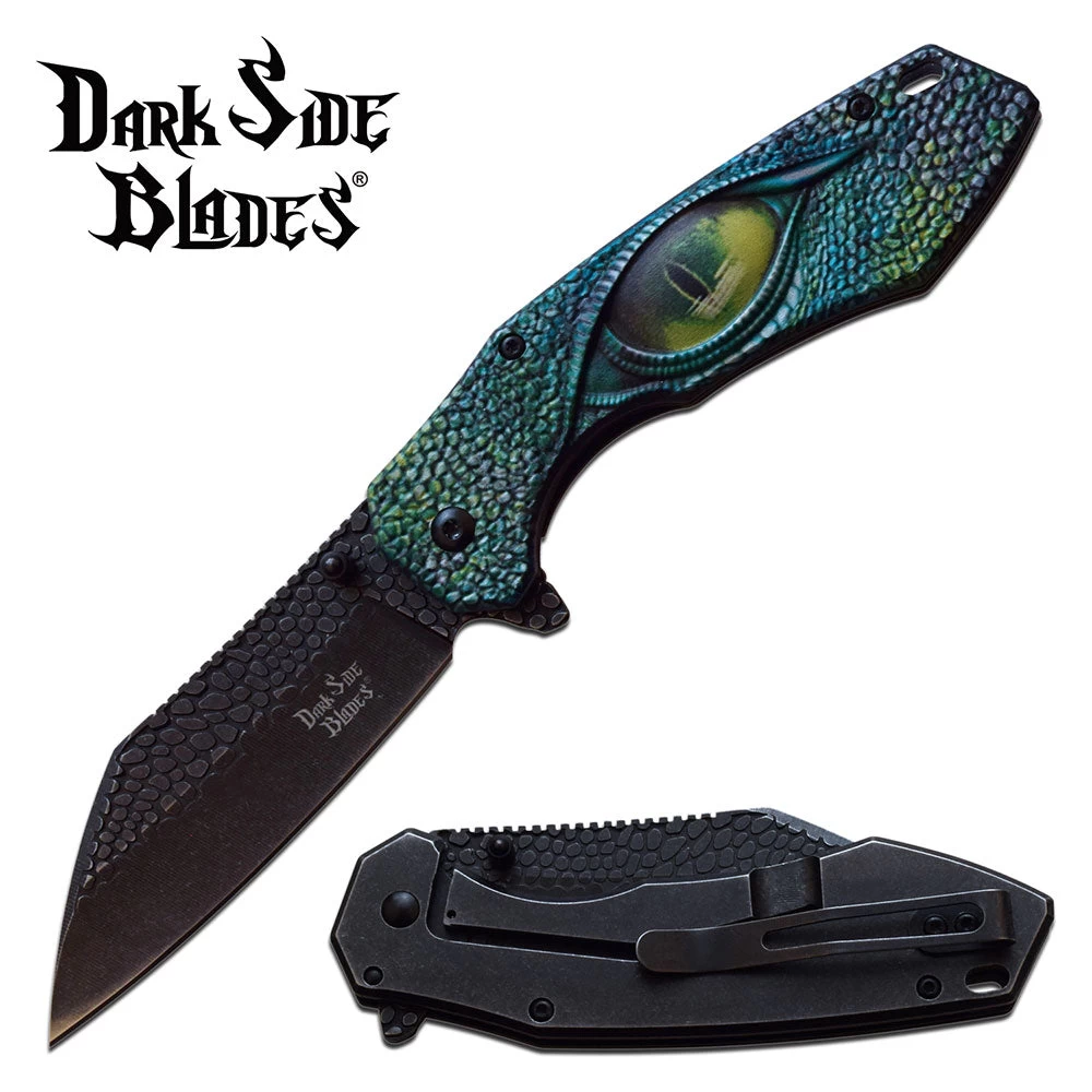 This Dark Side Blades green dragon scales and dragon eye fantasy pocket knife is a cool knife to have. This Dark Side Blades spring assisted pocket knife features a stonewashed blade with dragon scales design. The green stainless steel handle highlights textured dragon scales and dragon eye design. Includes frame lock and pocket clip.