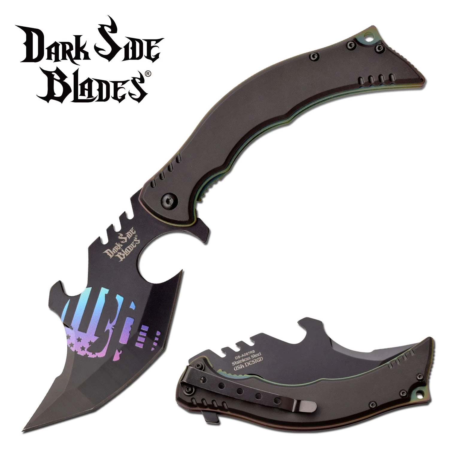 This Dark Side Blades U.S. Flag blue purple skull fantasy cool pocket knife is a nice spring assisted folding knife to have. This Dark Side Blades U.S. Flag fantasy cool pocket knife features a black steel acid etched blade with blue and purple skull design and U.S. Flag. The black anodized aluminum handle provides a secure grip. Includes a pocket clip.