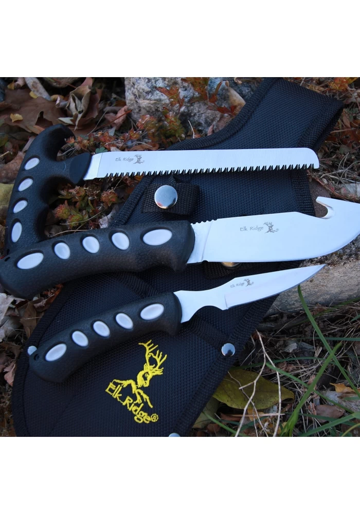 - SPECIAL FEATURES: Fixed Blade Knives- 3 Piece Hunting Knife Set, Black and Grey Nylon Fiber Handles, Includes Combo Nylon Sheath.
