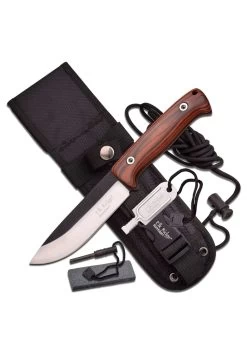 - SPECIAL FEATURES: Fixed Blade Knife, Full Tang Construction, Brown Wood Handle with Hidden Compartment. Hidden Compartment Contains a Sharpening Stone, Fire Starter and Small Survival Kit Which Are Stored in Handle. Knife Comes Complete with Nylon Sheath.