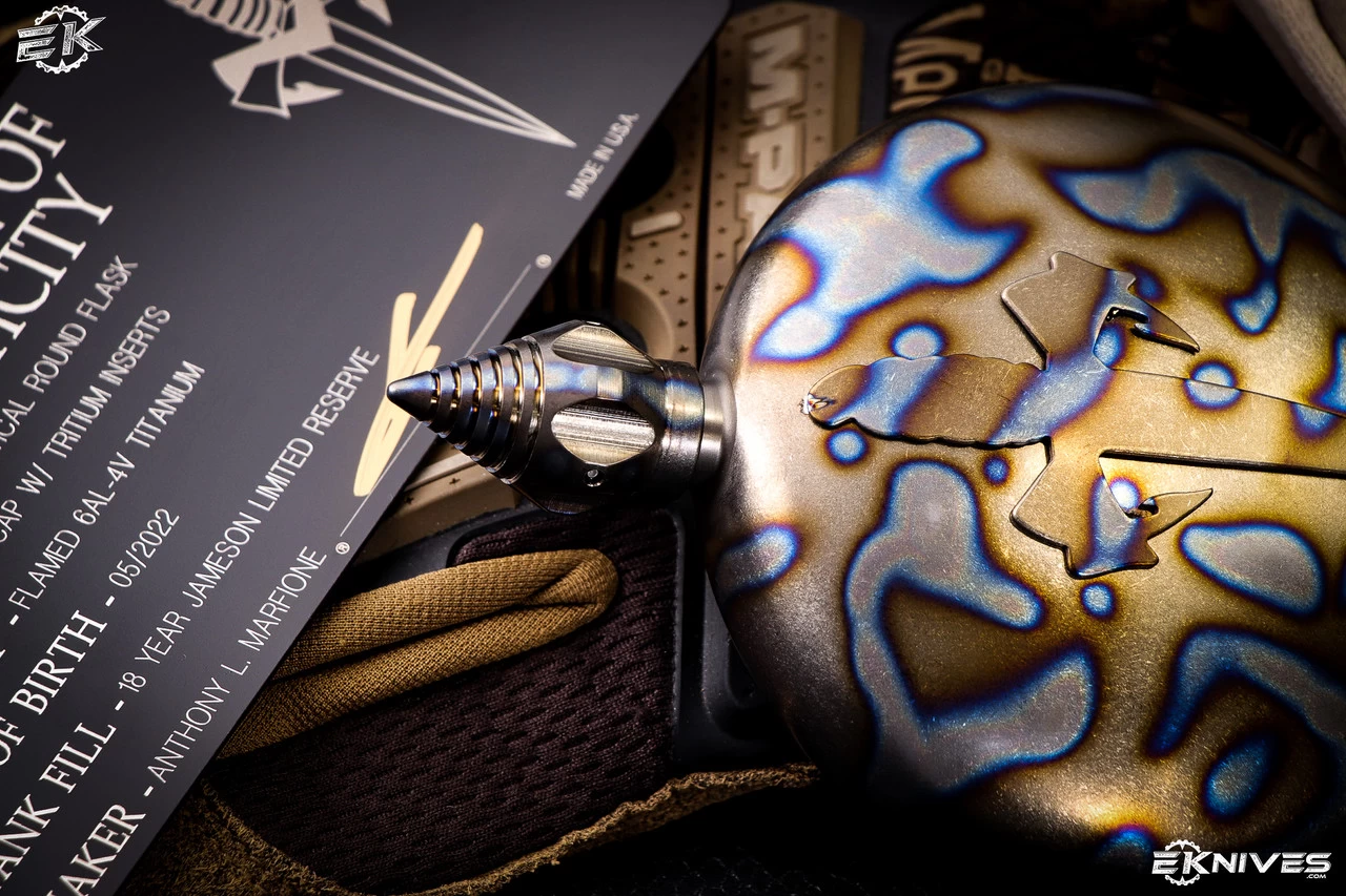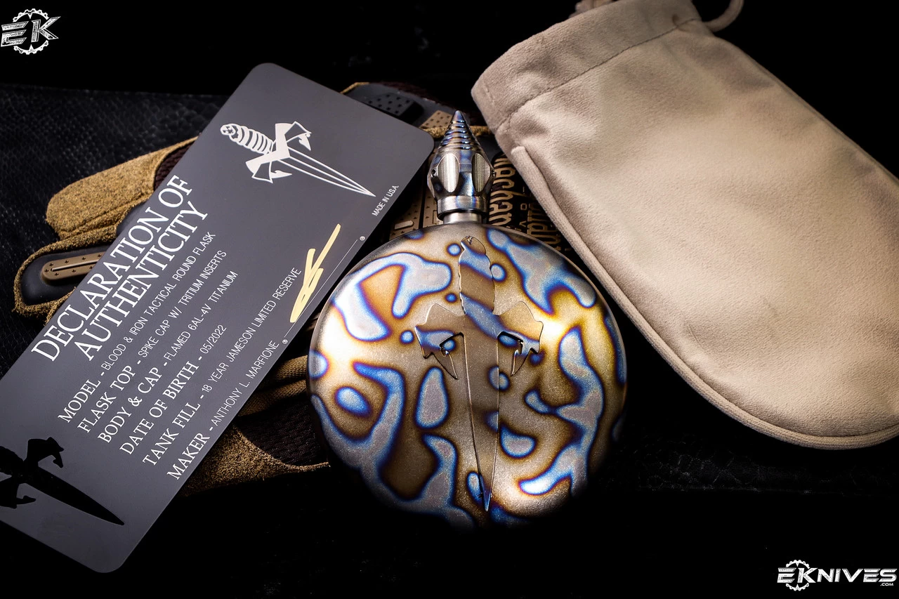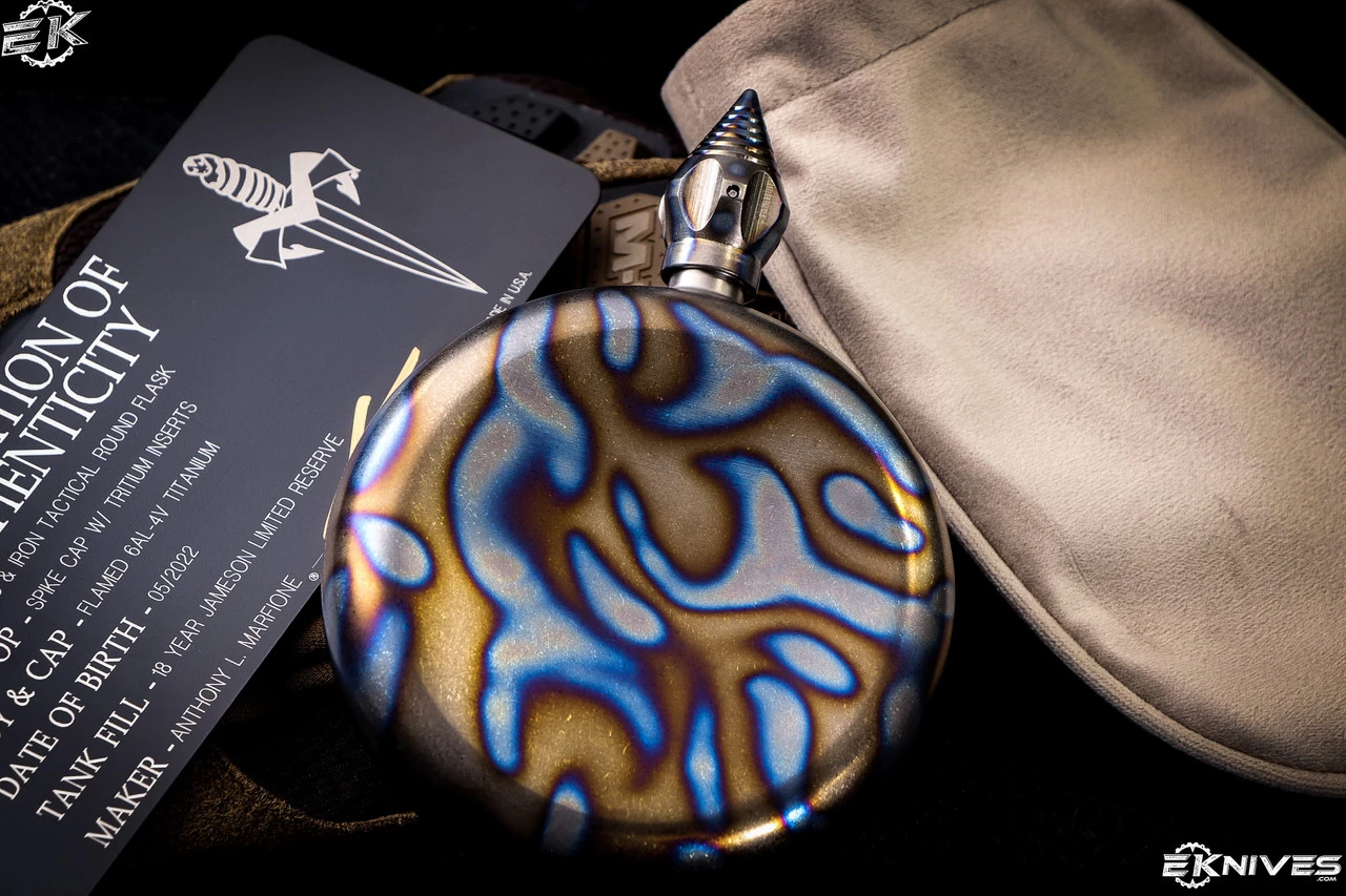 Marfione Custom Blood And Iron Tactical Round Flask Flamed Titanium, Spike Cap W/ Tritium Inserts, 18 Year Jameson