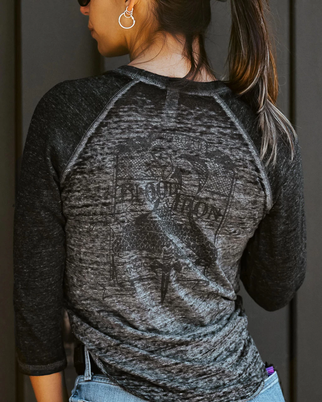 This USA-made baseball tee features our signature Blood & Iron graphic printed on tri-blend burnout wash fabric. This shirt has a slim fit and runs small.