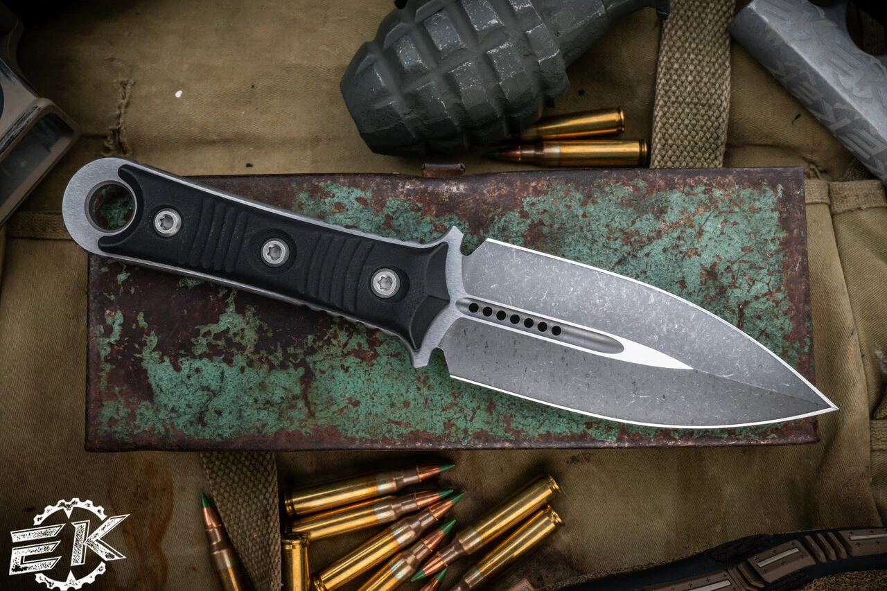 The SBD fixed blade is a menacing piece from custom knifemaker Sebastijan Berenji (Borka Blades), based off his own SBD design, a version of his famous SBK knife with upswept Persian blade shape. It features quad to the tip with blood groove and holes. The SBD handle is made of aesthetically pleasing G10 milled to perfection for grip ergonomics. Comes with kydex sheath.