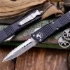 The Microtech Combat Troodon OTF automatic knife is named after the Troodon dinosaur and is the larger version of the Troodon OTF knife which debuted in 2006. The Combat Troodon is the largest OTF production knife available with an overall length of 9.5 inches. The Microtech Combat Troodon features a 3.8″ stainless steel double edge dagger style blade. The 5.75″ handle is anodized aluminum and features hardware, glass breaker and pocket clip. Yes this is a larger OTF knife but it feels great in the hand thanks to the jimping in the handle. The aluminum handle features a double action thumb slide that allows for super fast automatic blade deployment and retraction with the push of your thumb.