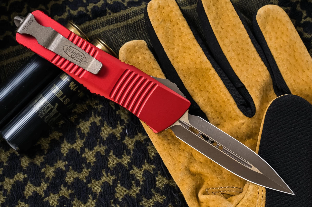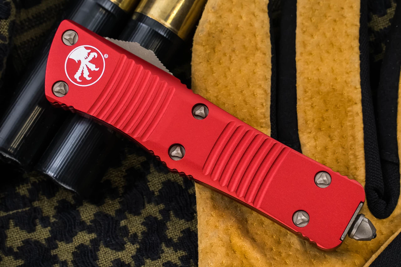 The Microtech Troodon OTF (out the front) automatic knife is named after the Troodon (Troh O Don) Dinosaur and features a double edged dagger style 3″ blade. The Microtech Troodon T6 aluminum handle measures 4.25″ and is a slim fit that works well in the hand.