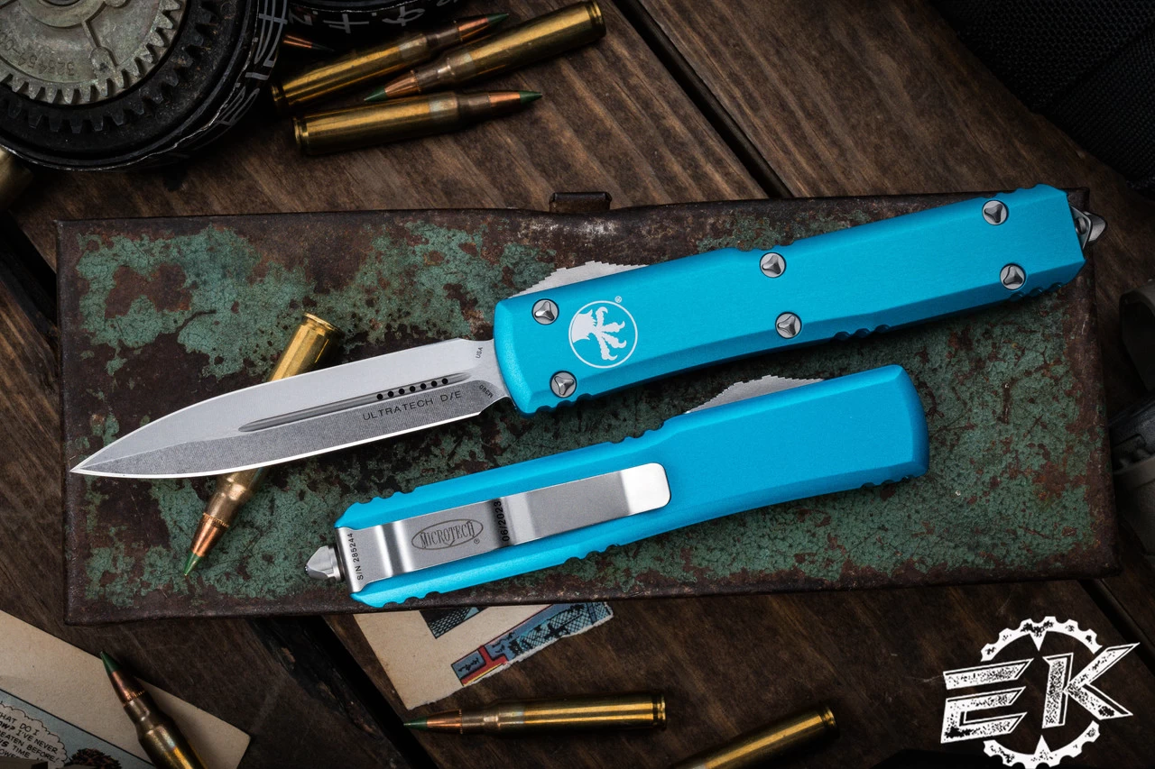 The Microtech Ultratech is the first ever OTF (out the front) automatic knife produced by Microtech Knives. The dual action automatic that started it all is the smoothest operating out the front you will find. It features a 3.4″ blade. The Ultratech has a 5″ anodized 6061-T6 aluminum contour handle with bead blast finished pocket clip, glass breaker and stainless steel hardware. The double action slide switch allows for fast automatic deployment and retraction when you need it. The slim design of the Ultra make it the perfect EDC knife.