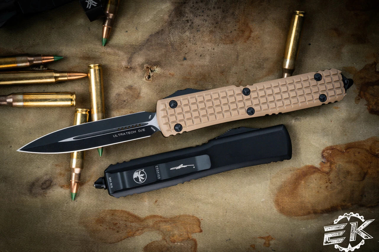- Handle: 5″ Tan Frag G10/Black Aluminum