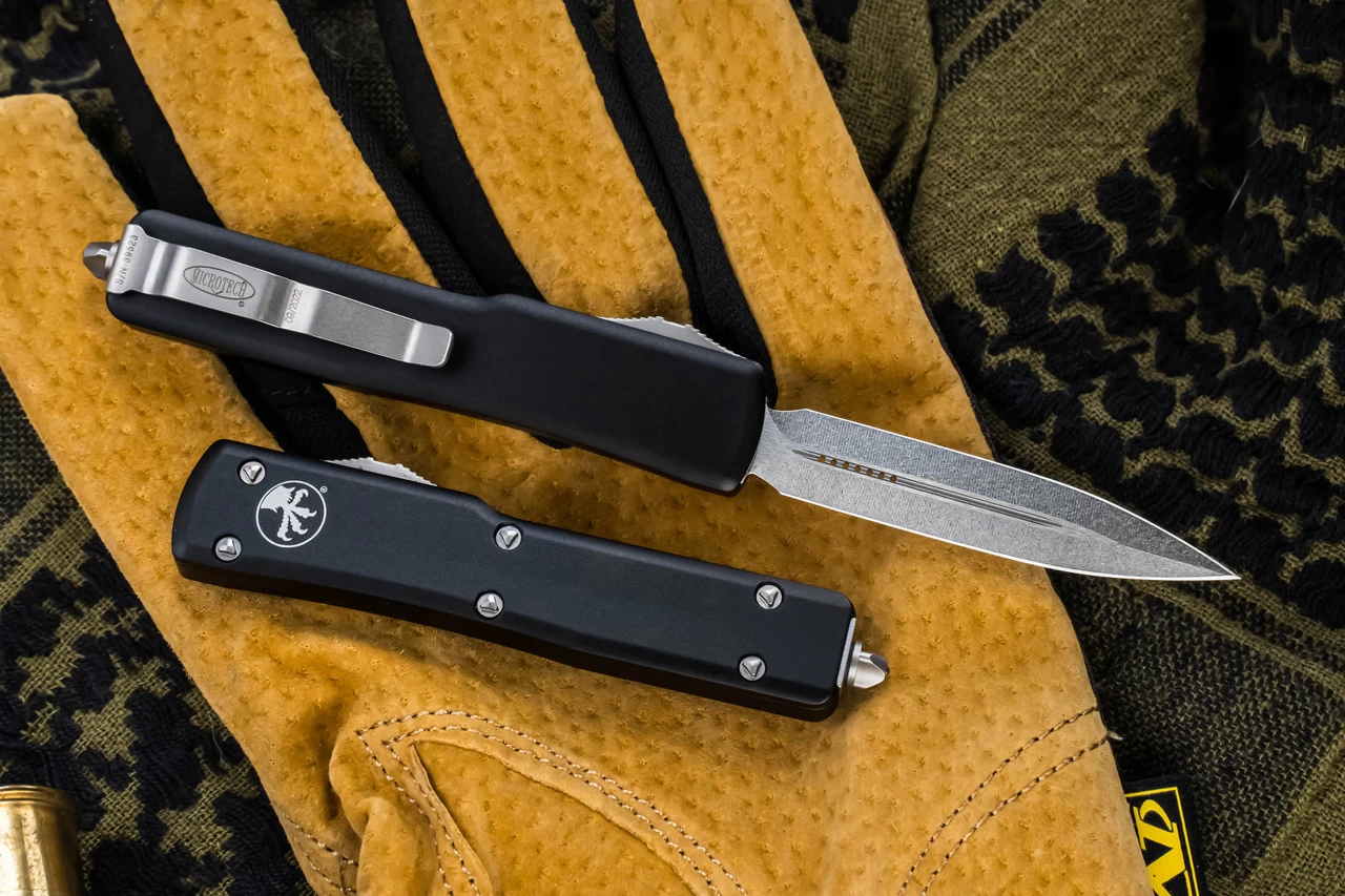 Who said size doesn’t matter? The Microtech UTX-70 is one of the smallest OTF (out the front) automatics on the market. At 70% the size of the Ultratech (hence the name), Microtech’s smallest OTF knife, the UTX-70 has the same simplistic design and internal spring mechanism that has powered its entire line for decades. The spring remains “at rest” until the blade is deployed ensuring it fires effectively every time. The black anodized aluminum handle measures just over 3 inches long and features bead blast hardware, pocket clip and auto firing slide switch on the side. The slide switch deploys and retracts the OTF rapidly with one push making it a perfectÌ´Ì_EDC OTF knife. The Microtech UTX-70 OTF auto features a 2.4″ double edge dagger blade with a stonewash finish. The UTX 70 auto is perfect sized for the hand and pocket.