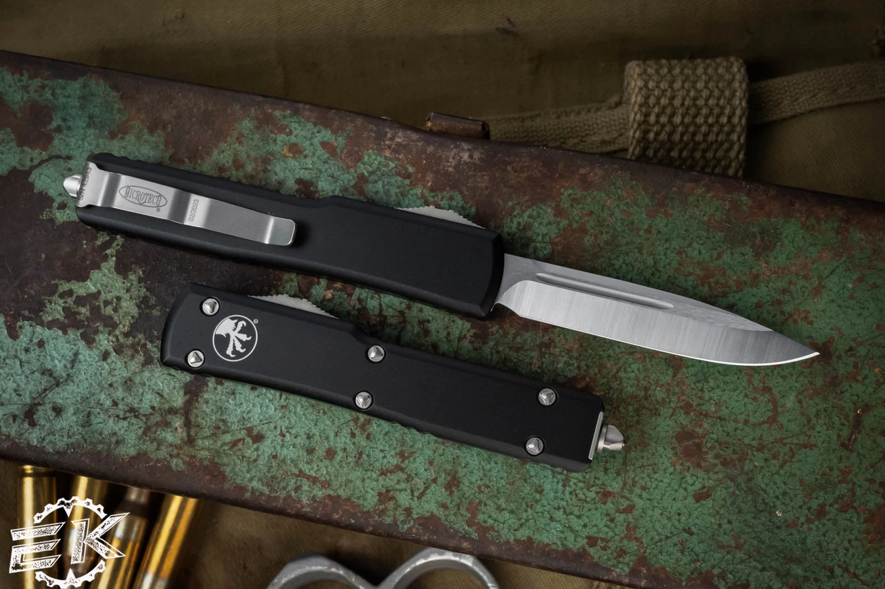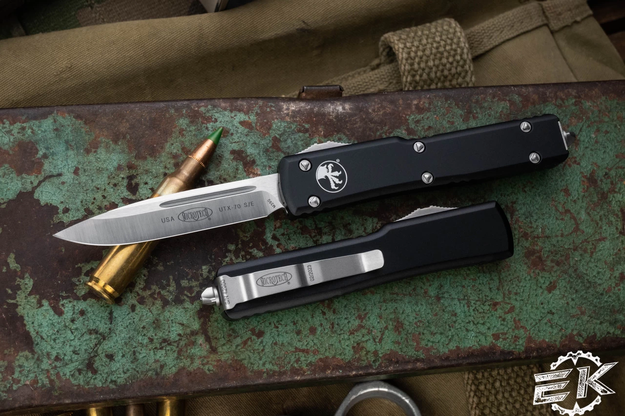 Who said size doesn’t matter? The Microtech UTX-70 is one of the smallest OTF (out the front) automatics on the market. At 70% the size of the Ultratech, Microtech’s first ever OTF knife, the UTX-70 has the same simplistic design and internal spring makeup. The spring remains “at rest” until the blade is deployed ensuring it fires effectively every time. The black anodized aluminum handle measures just over 3 inches long and features bead blast hardware, pocket clip and auto firing slide switch on the side. The thumb slide deploys and retracts the OTF rapidly with one push making it a perfect EDC knife. The Microtech UTX-70 OTF auto features a 2.4″ single edge drop point plain blade with a satin finish. The UTX 70 auto is perfect sized for the hand and pocket.