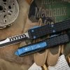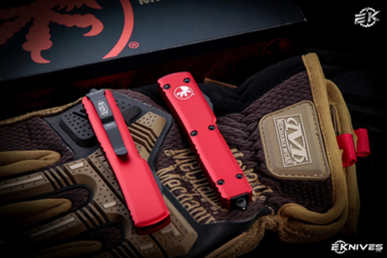 Who said size doesn’t matter? The Microtech UTX-70 is one of the smallest OTF (out the front) automatics on the market. At 70% the size of the Ultratech, Microtech’s first ever OTF knife, the UTX-70 has the same simplistic design and internal spring makeup. The spring remains “at rest” until the blade is deployed ensuring it fires effectively every time. The anodized aluminum handle measures just over 3 inches long and features bead blast hardware, pocket clip and auto firing slide switch on the side. The slide switch deploys and retracts the OTF rapidly with one push making it a perfect EDC OTF knife. The Microtech UTX-70 OTF auto features a 2.4″ double edge dagger standard blade with a stonewash finish. The UTX 70 auto is perfect sized for the hand and pocket.