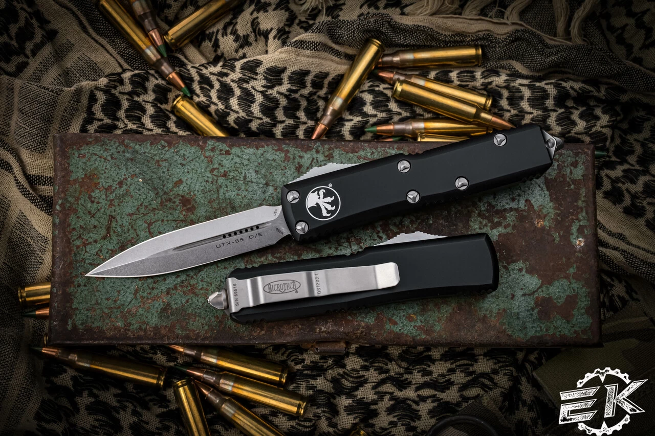 The Microtech UTX-85 out the front knife is a compact pocket friendly auto with functional greatness packaged into Microtech’s stellar design perfected by company owner Anthony Marfione. The UTX 85 comes with a very high quality steel blade and stainless steel hardware including screws, pocket clip and thumb slide for deployment and retraction.