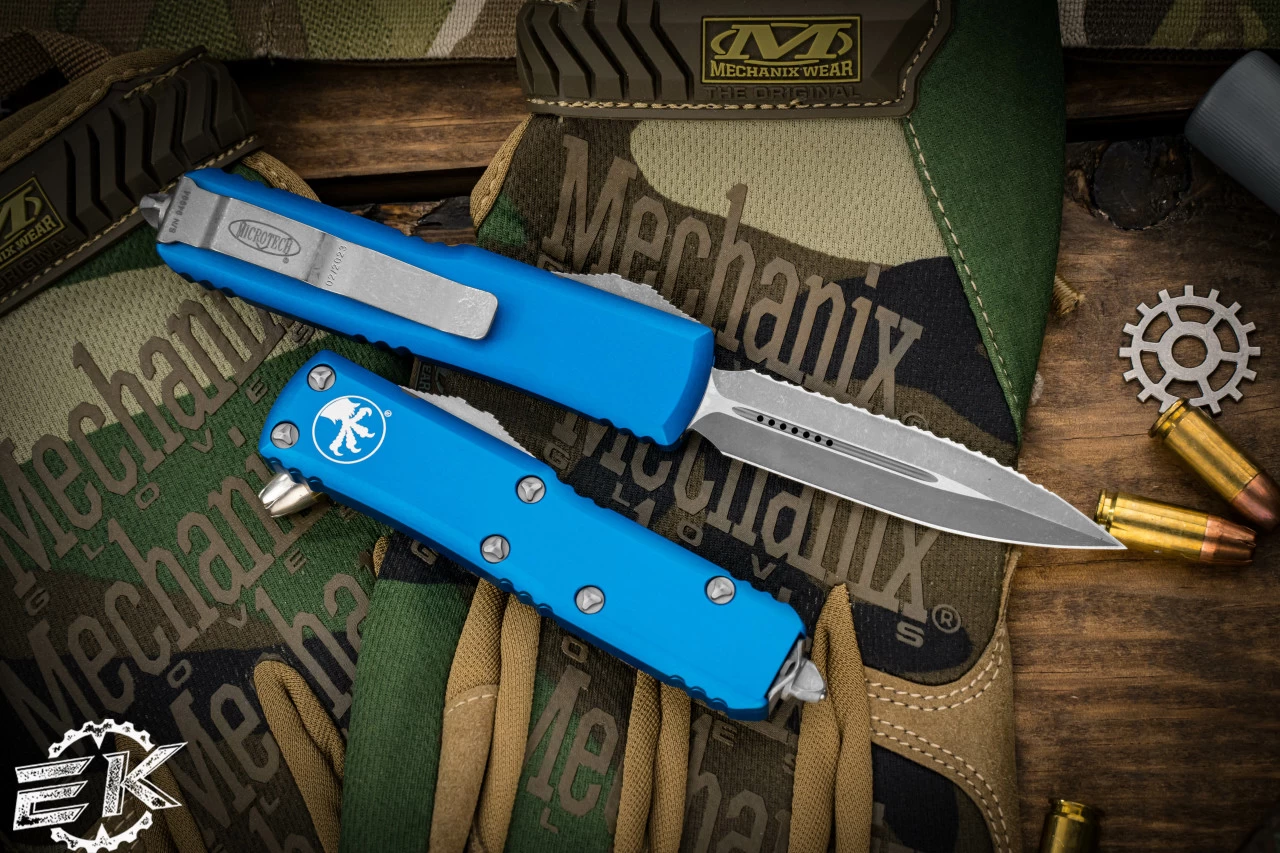 Microtech UTX-85 Blue OTF 3″ Dagger Stonewash Apocalyptic Serrated 232-12APBL