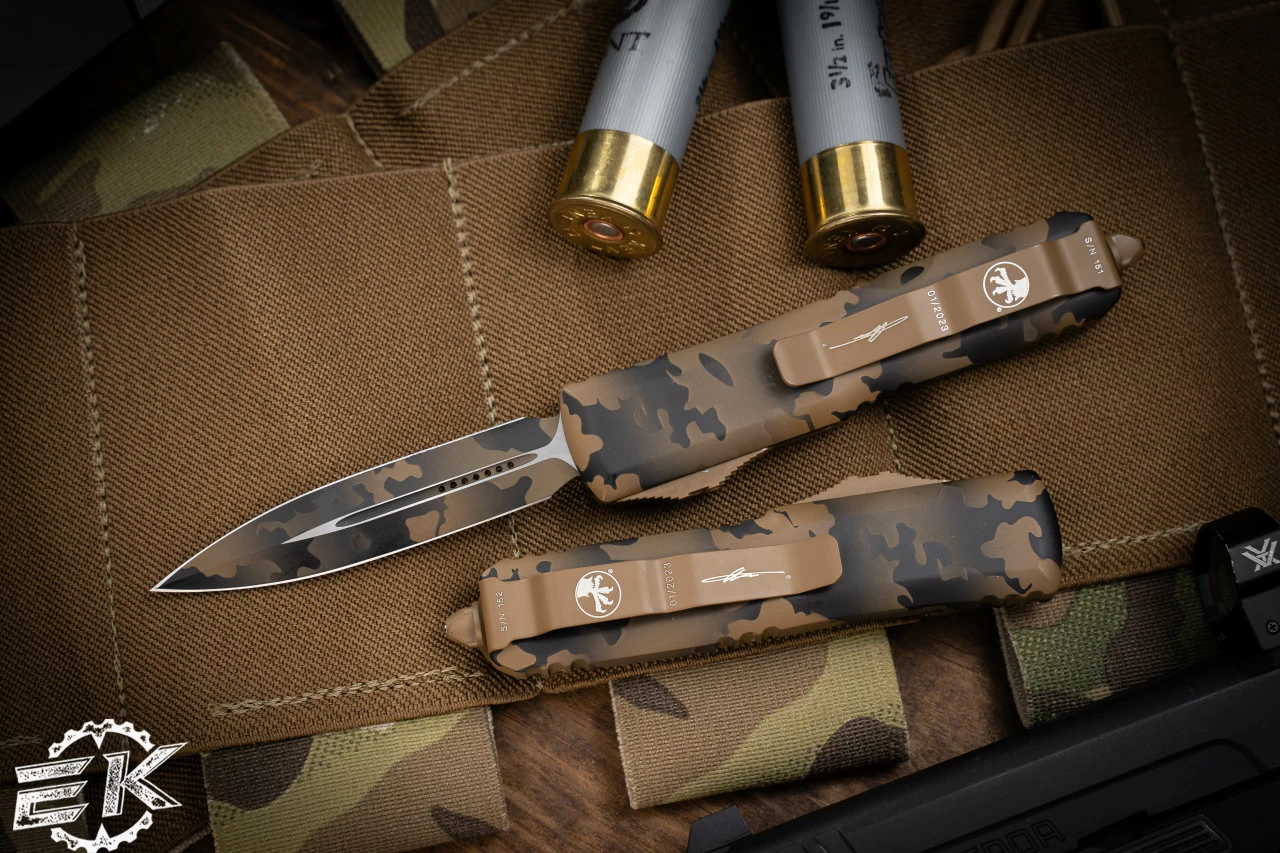 The Microtech UTX-85 out-the-front knife is a compact pocket friendly automatic with functional greatness packaged into Microtech’s stellar design. The UTX-85, the smaller option for Ultratech lovers, features a 4.5″ Cerakoted 6061-T6 aluminum handle with stainless pocket clip, glass breaker and hardware. This UTX-85 features a Cerakoted blade measuring 3.1″ long. The blade fires via double action thumb slider located on the side of the handle for quick one handed automatic deployment and retraction.