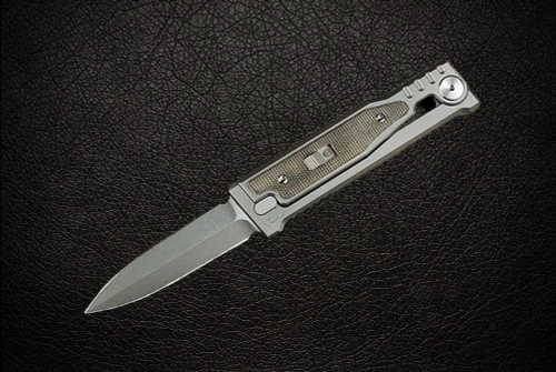 Reate Knives EXO-M Exoskeleton Design Manual OTF Knife Double Edge Dagger Stonewash Blade W/ Titanium And Green Micarta Handles