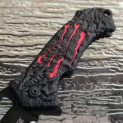 This Z-Hunter Zombie Pocket Knife is a great fantasy knife to add to the collection. Featuring a partially serrated stainless steel blade with biohazard symbol, this knife is great for any task. The aluminum handle with red claw marks provides an excellent grip. This zombie hunter raptor knife comes with a belt clip for easy carry.